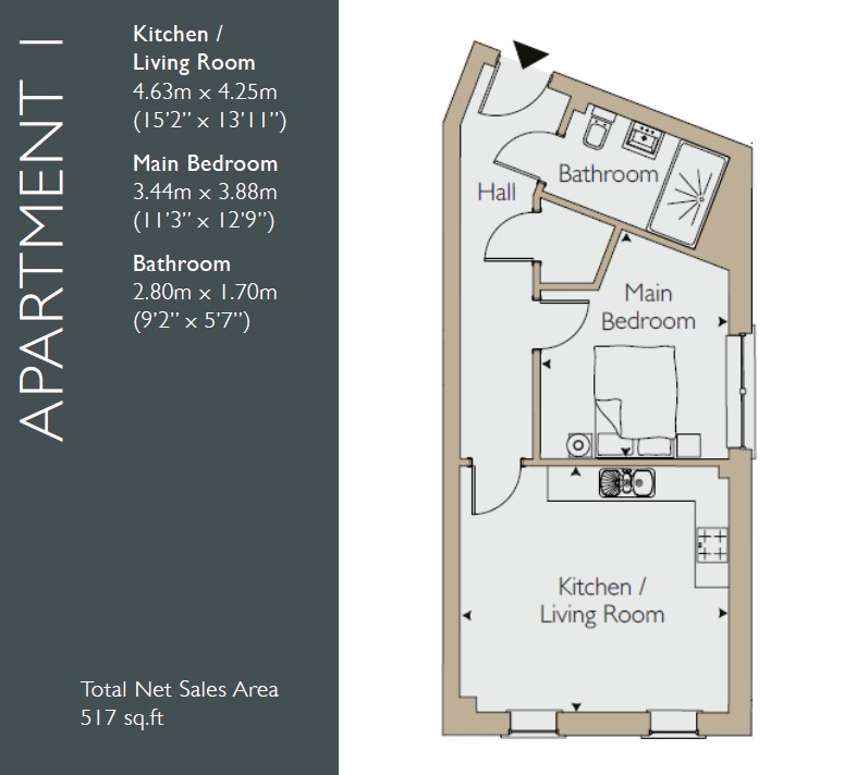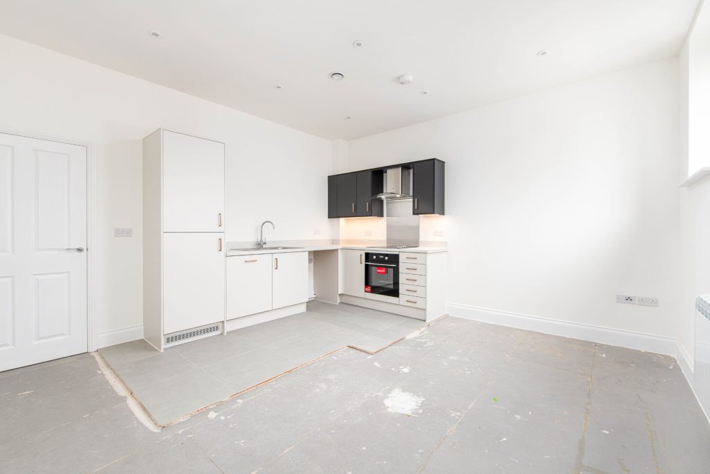 A well-proportioned one-bedroom apartment offering an open-plan kitchen and living area, ideal for modern living. The generous double bedroom provides a calm retreat, while a contemporary bathroom and hallway with storage complete this home.