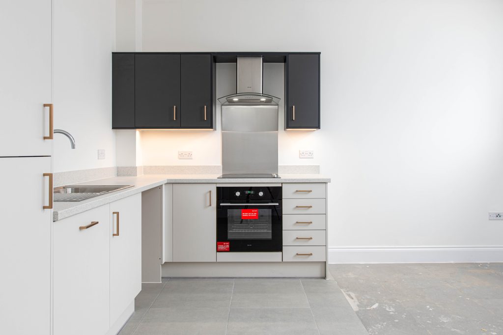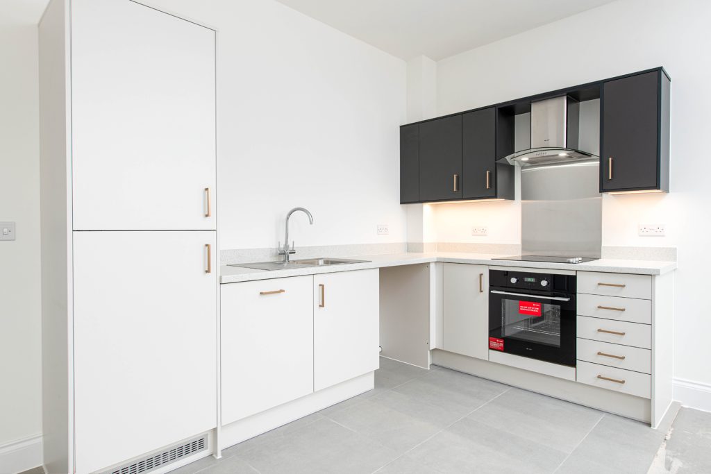 - Fully integrated appliances including dishwasher and fridge freezer.